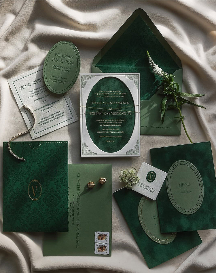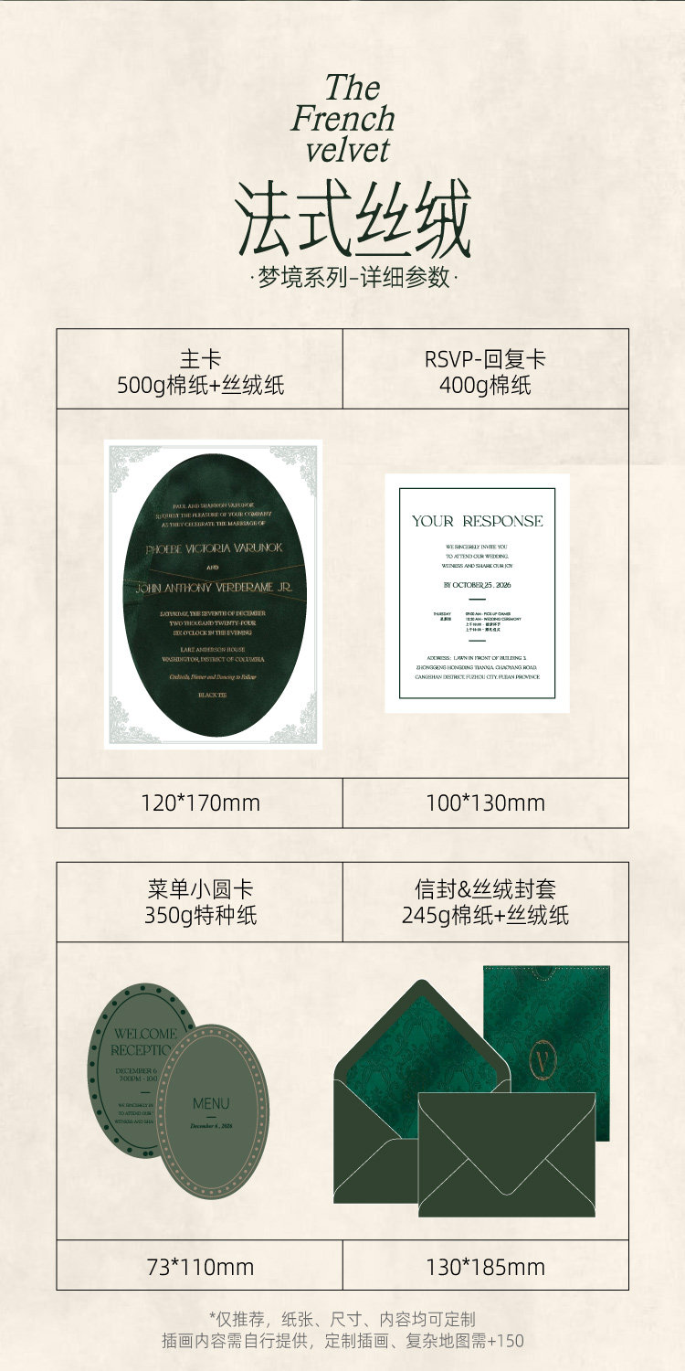 丝绒主卡每100份单价, RSVP回执卡每100份单价, 菜单小圆卡每100份单价, 信封无内衬每100份单价, 信封带丝绒内衬每100份单价, 丝绒封套每100份单价, 封套棉纸压凹每100份单价